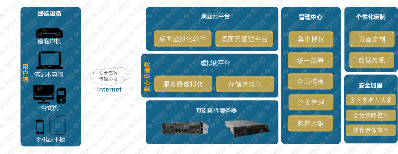 安全移动工作空间解决方案,以云计算的理念,使用服务器虚拟化、桌面虚拟化及应用虚拟化技术,解决或改善传统PC所面临的问题和挑战。企业所有后台应用系统及数据部署在数据中心服务器,所有用户桌面也在数据中心的交付平台上运行,终端仅接受交付平台上应用运行的屏幕画面像素,而无实际数据传输。后台实现全局模板,统一管理,批量交付,同时针对不同客户推出定制化集成开发服务,满足客户差异化的需求。